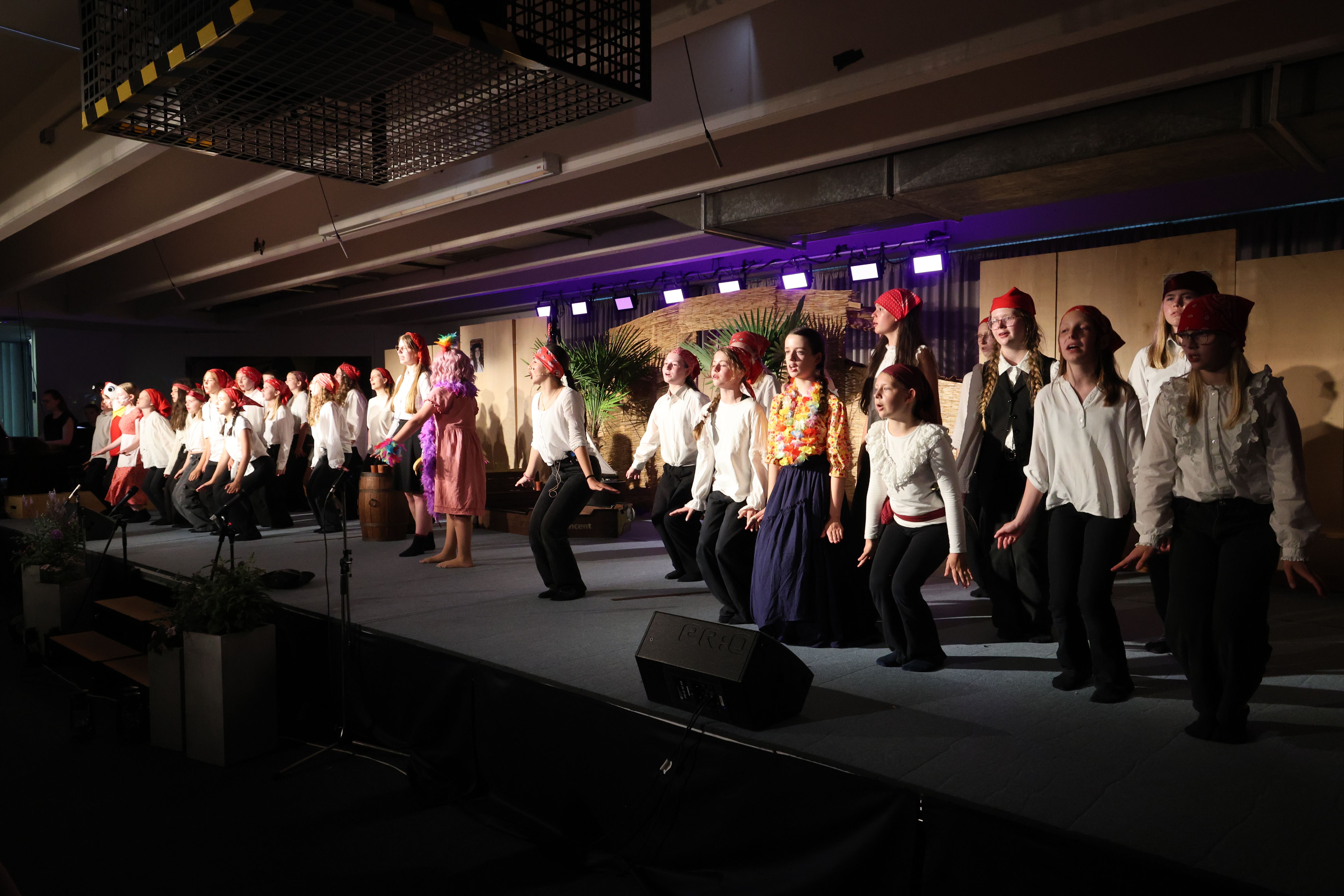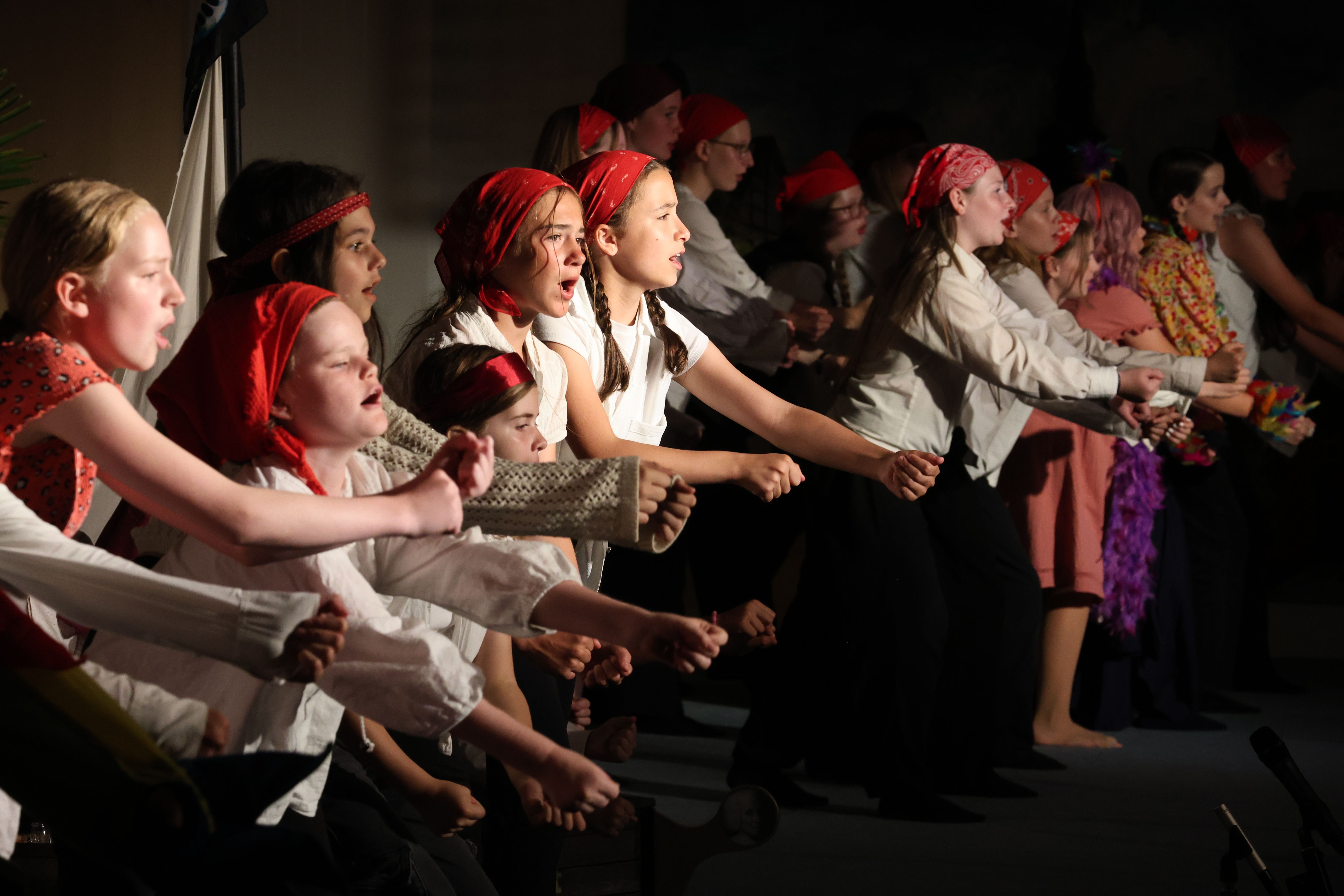 Wir erarbeiten Lieder, die alle gemeinsam singen oder in denen sich der Chor in mehrere Stimmen teilt. Manchmal singen wir auch Stücke, in denen wir Solisten aus dem Chor benötigen oder schauspielern oder tanzen müssen.
