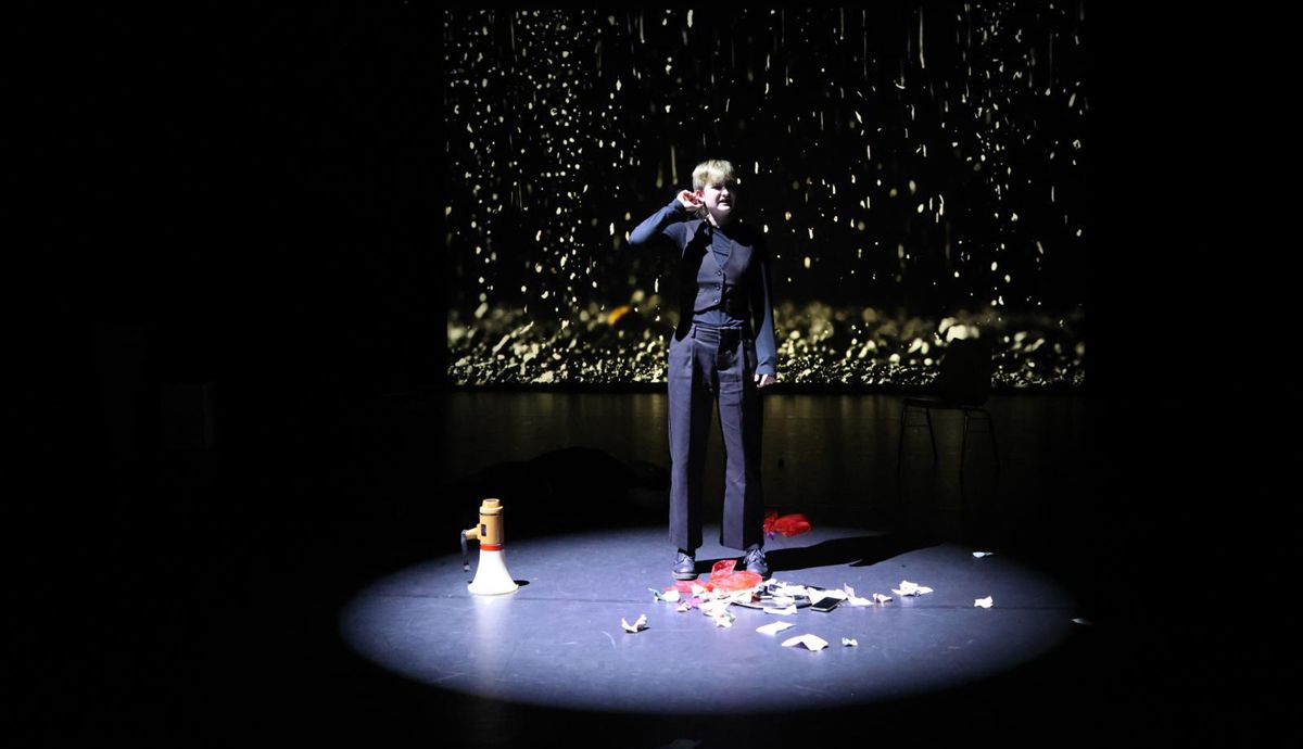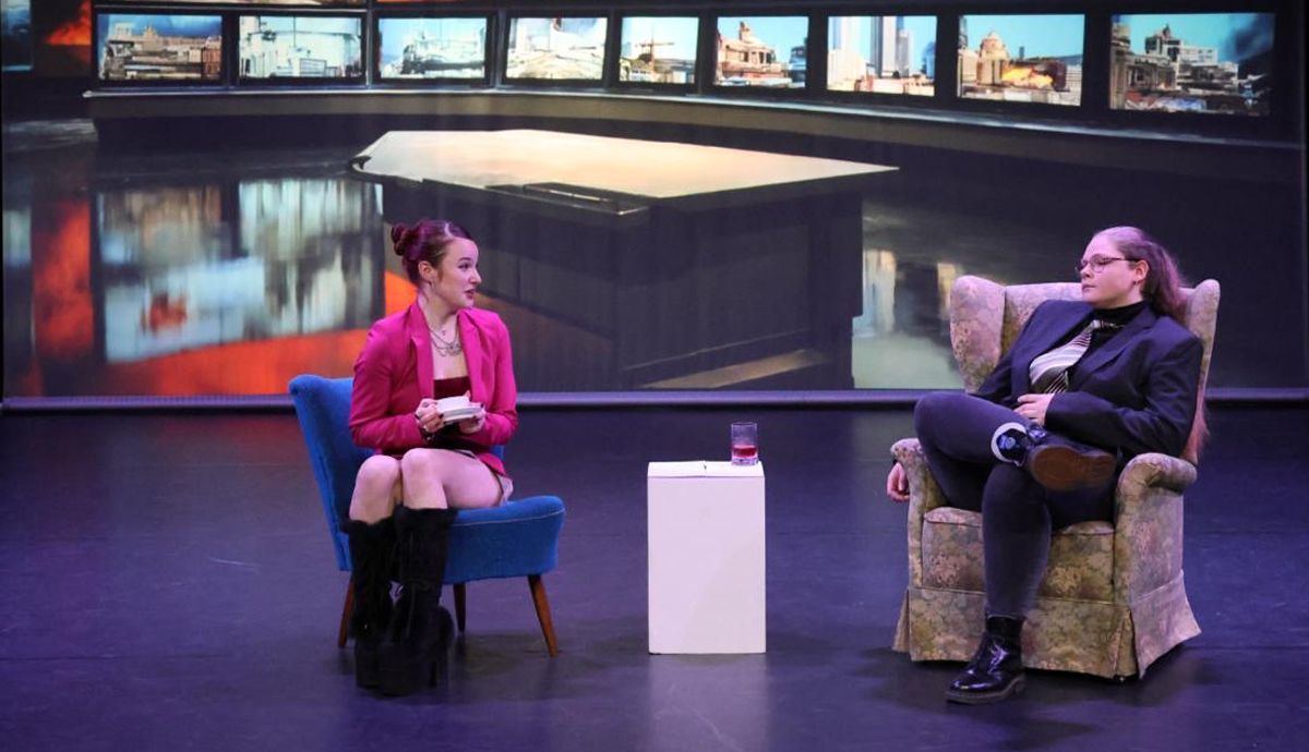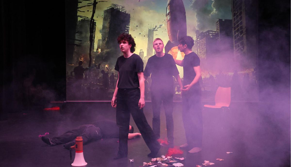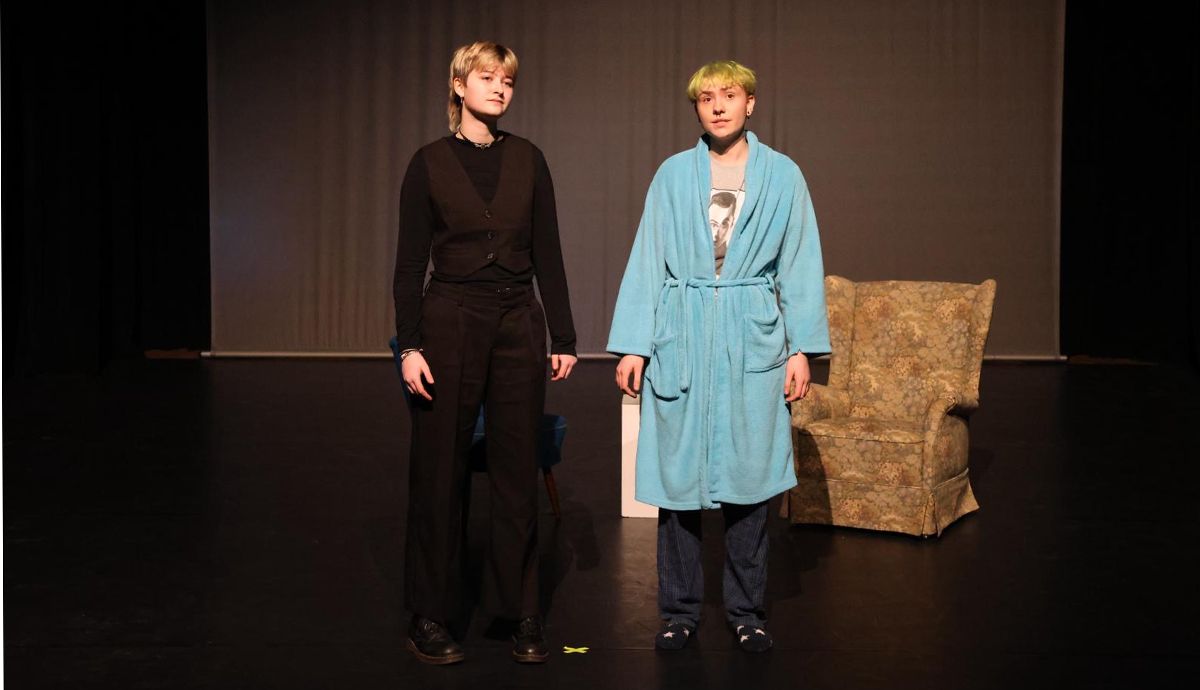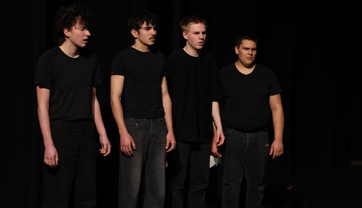 Als wir in Scheeßel ankamen, wurden wir herzlich von der Eichenschule Scheeßel begrüßt und sofort in den Theatersaal geführt, in welchem die erste Gruppe auch gleich ihr Stück präsentierte. Nach drei weiteren Gruppen und vier Pausen war es dann soweit: Wir waren an der Reihe Ausschnitte aus unserem Stück „Und wenn ich von der Zeit spreche, spreche ich von der Zeit, die schon nicht mehr ist. Am Rande des Rollfelds“ vorzustellen. Zuerst wurde uns die Bühne gezeigt, welche Bereiche wir betreten dürfen und welche nicht und wir probten kurz mit den Technikern, die uns mit Licht, Ton und Bild versorgt haben.