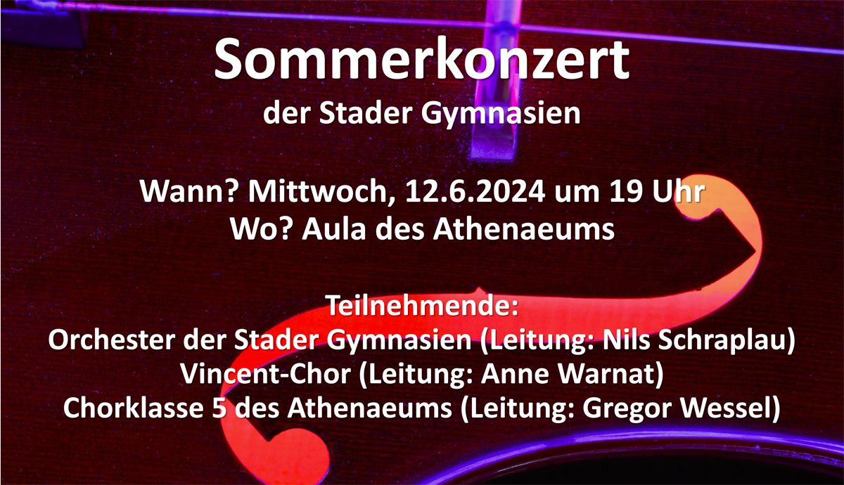 Am Mittwoch, dem 12. Juni laden das gemeinsame Orchester der Stader Gymnasien, der Vincent-Chor und die Chorklasse 5 des Athenaeums ein zu ihrem gemeinsamen Sommerkonzert. Das Konzert wird um 19 Uhr in der Aula des Athenaeums gegeben, der Eintritt ist frei. Ansprechpartner sind Herr Schraplau und Frau Warnat.