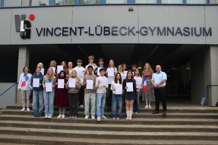 Das VLG hat im letzten Schuljahr das erste Mal an einem DELF-Modellversuch teilgenommen. Alle Französisch-Schüler*innen des Jahrgangs 10 haben dafür statt einer dritten Klassenarbeit den schriftlichen Teil der DELF-Prüfung A2 abgelegt. 23 von ihnen sind dann Anfang Juni zur mündlichen Prüfung angetreten und haben alle bestanden. Wir konnten ihnen daher noch vor den Ferien ein A2-Zertifikat für Französisch verleihen. Herzlichen Glückwunsch an alle Kandidat*innen!
