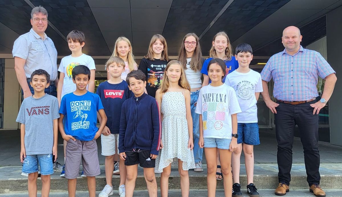 Stellvertretend für alle Schülerinnen und Schüler sind die Teilnehmer aus einer 5. Klasse mit Herrn Quast und Herrn Wauschkies abgebildet.
