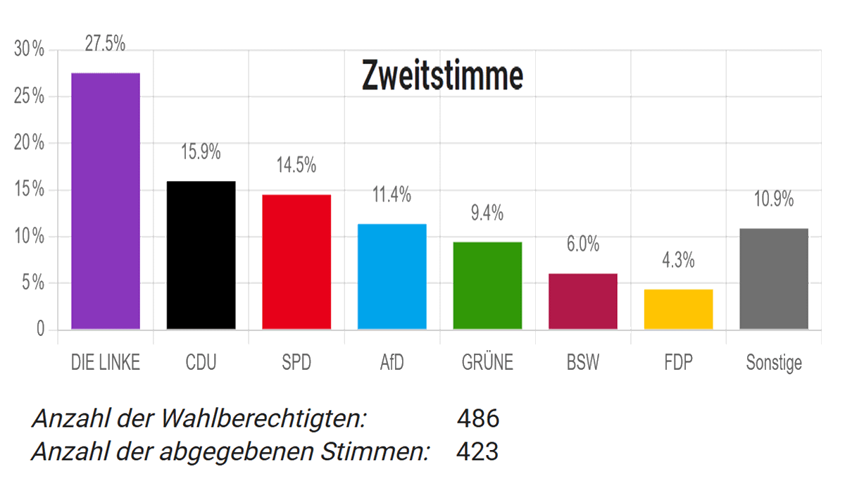 Trotz Grippewelle konnten wir eine Wahlbeteiligung von 87,04% erreichen, bei 486 Wahlberechtigten der Jahrgänge 9 bis 12 gaben 423 ihre Stimme ab, nur 8 Stimmzettel waren ungültig.
