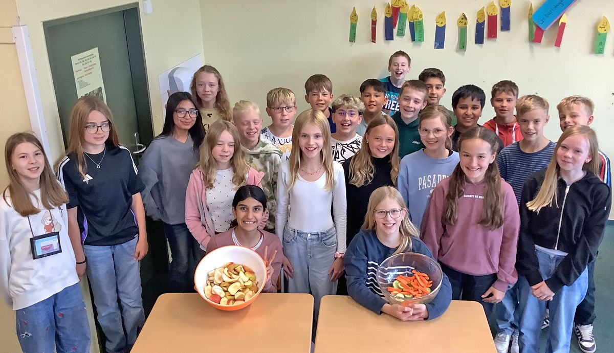 Wir machen mit beim Schulobst-Programm: Seit Dienstag erhält unsere Schule Obst und Gemüse aus der Region. Die Klassen 5 und 6 freuen sich über den gesunden Pausensnack und sorgen eigenständig für die Zubereitung der Äpfel, Birnen, Möhren und Gurken. Immer dienstags wird geliefert, bis Donnerstag ist alles verputzt. Guten Appetit!