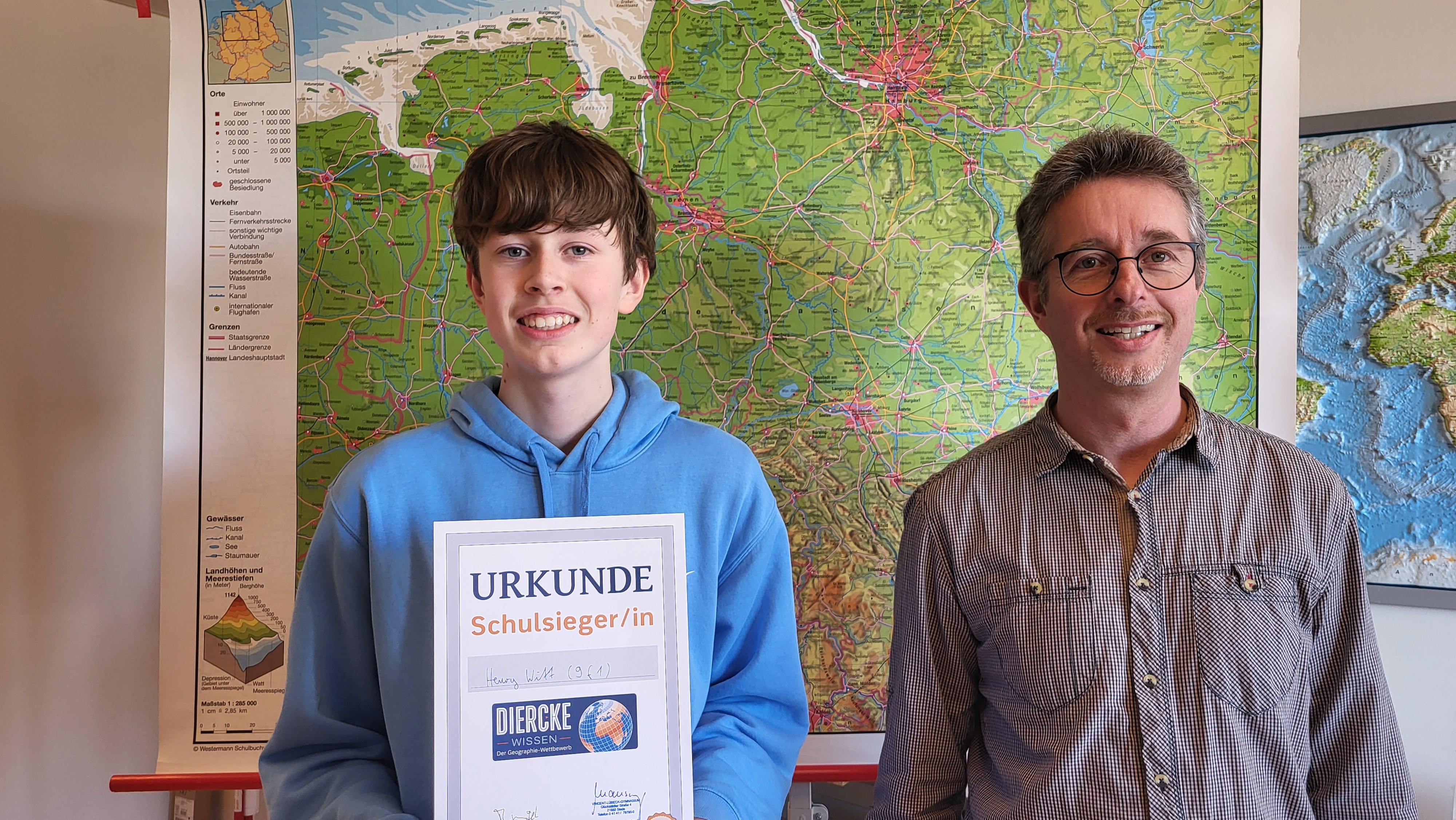 Beim diesjährigen Diercke-Wissen-Wettbewerb konnte sich (wie in den beiden letzten Jahren) erneut Henry Witt aus der 9f1 durchsetzen. Während in der ersten Runde (Klassenebene) noch Aare Schmidt (8k1) die höchste Punktzahl erreichte, setzte Henry sich in der zweiten Runde gegen alle anderen Klassensieger der Jahrgänge 7-10 durch.